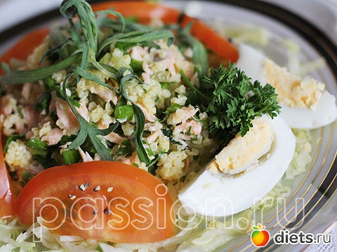 Листья «Айсберга» нарезать тонкой соломкой и выложить на порционные тарелки, сверху - салат с пшеном.
