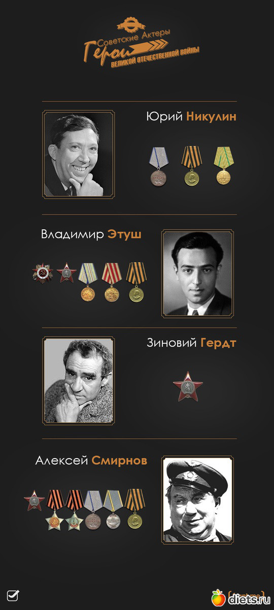 Юрий Никулин, Владимир Этуш, Зиновий Гердт, Алексей Смирнов - обладатели многих медалей, полученных в Великой Отечественной войне.
