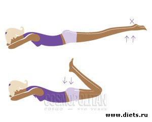 Приподними бедра над полом и сделай 10-30 ударов пятками друг о друга. На первые 5 ударов делаем вдох, на вторые 5 – выдох. Затем согни ноги в коленях и постарайся достать пятками до ягодиц. Вернись в и. п.
