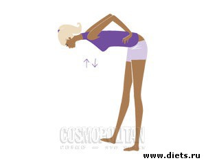 На вдохе наклонись вперед максимально низко (сгибая тело в области таза), спина ровная. Пресс напряжен. На выдохе, напрягая мышцы ног и ягодиц, поднимись, возвращаясь в и. п.