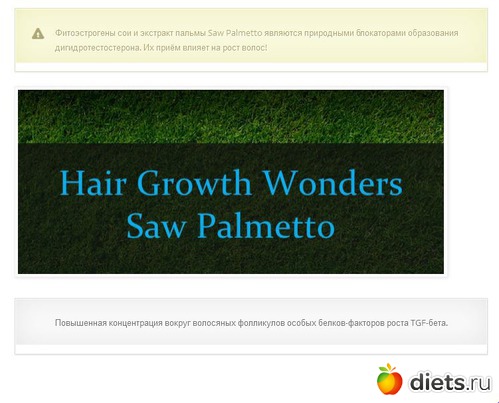- изофлавоны сои и экстракт пальмы Saw Palmetto блокируют действие дигидротестостерона и восполняют нехватку гормона эстрогена, способствующего росту здоровых молодых волос