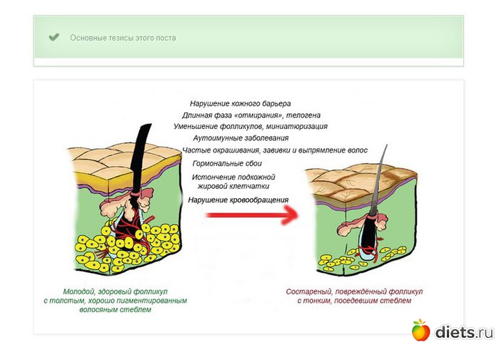 Фиброз, (избыточное наслоение ткани), пережимает кровеносные сосуды и капилляры, перекрывая доступ и кислорода, и питательных веществ в волосяной сосочек, что приводит либо к его смерти, либо к миниатюризации волосяного фолликула, который начнёт производить истончённые волосы или «пух», как и в предыдущем пункте про тестостерон.