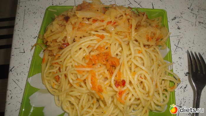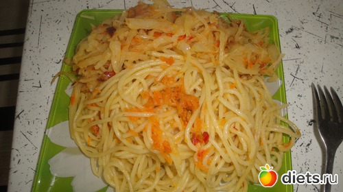 О:спагетти с луком и морковкой и мужу тушила на обед постную капусту, захотелось еще капусты такой.