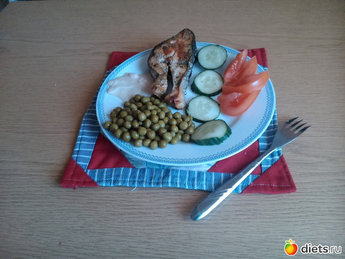 Обед - красная рыба жаренная без масла, соус из натурального йогурта и соевого соуса, зеленый горошек, огурец, помидоры... Читать полностью