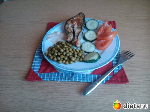 Обед - красная рыба жаренная без масла, соус из натурального йогурта и соевого соуса, зеленый горошек, огурец, помидоры...