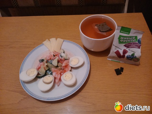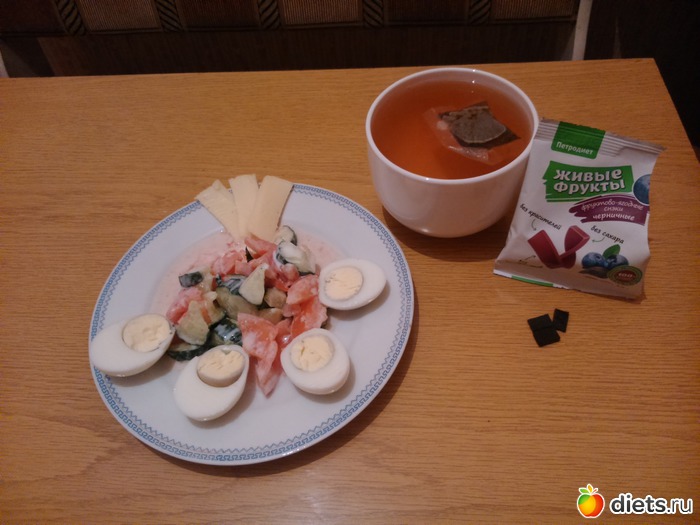 Ужин - салат из огурца и помидора (заправила йогуртом), 2 яйца, немного сыра, чай и 3 вкусняшки...