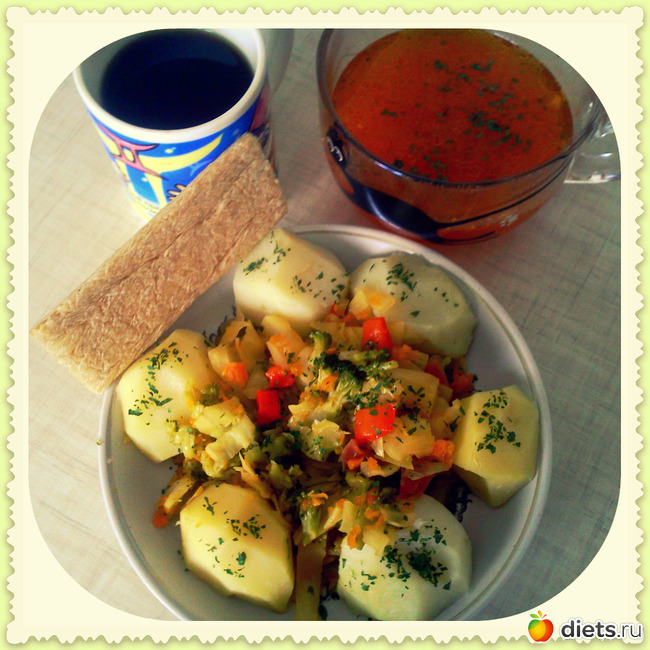 О - отварной картофель( как я его давно не ела ммм) плюс овощи вареные, бульон овощной + хлебец