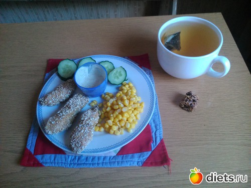 Обед - кукурузка, огурчик, куриная грудка в панировке из геркулеса (запекла в духовке), соус (из натурального йогурта, соевого соуса и приправы), чаек и 1\3 фитнес батончика.