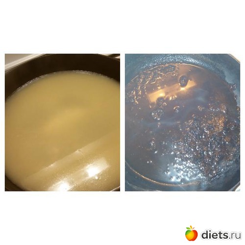 3. Когда сыворотка уварилась до 0,5 л (на это уходит примерно 1 час), вливаем сливки. Хорошенько размешиваем. Увариваем ещё примерно до половины. К этому времени у нас в кастрюле уже не полупрозрачная жидкость, а студенистая желто-бежевая довольно густая масса.