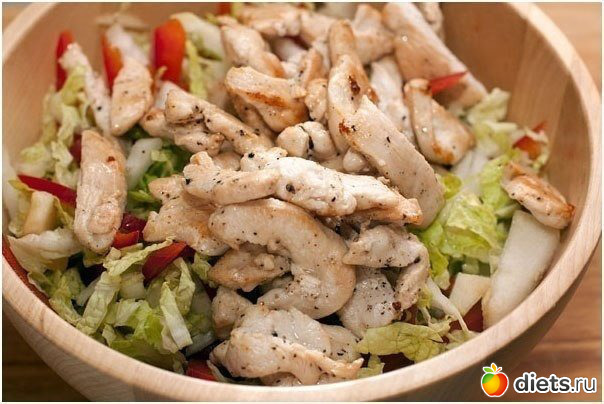 5) Готовую и слегка остывшую курицу добавьте в салат, хорошо перемешайте.