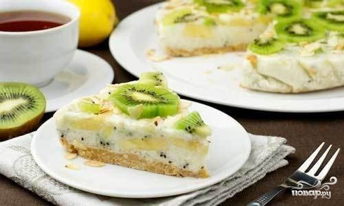 На корж выложить 1-2 порезанных банана. Затем залить всё йогуртовой массой и поставить застывать в морозильную камеру или холодильник на 6 часов или на ночь.