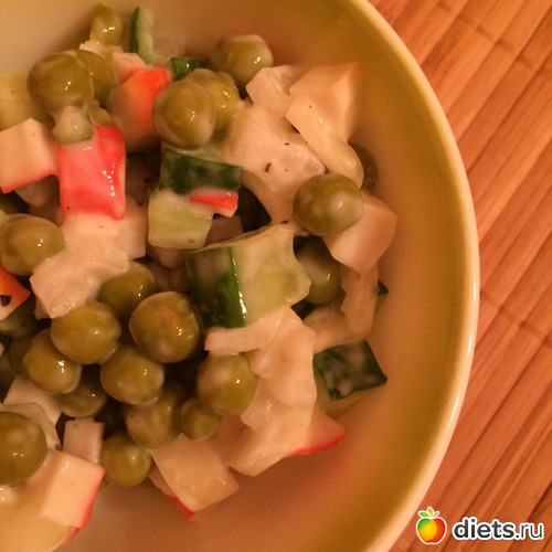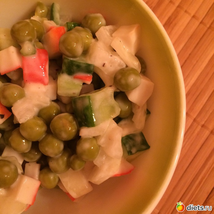 Салатик с крабовыми палочками, огурцом и зеленым горошком(альтернатива крабовому, когда нет кукурузы