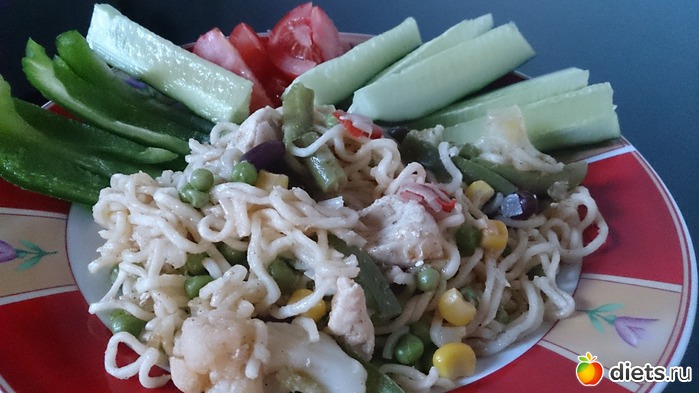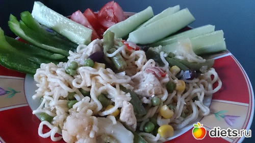Обед: китайская вермишель с овощами и куриным филе, половинка помидора, оугрец и перец сладкий.