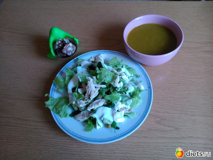 Обед - суп-пюре из тыквы, брокколи, морковки и куриного бульона, и целая тарелка салата (листья салата, 50г куриной грудки, 2ст. ложки горошка, немного огурца, 30г брынзы, заправила все натуральным йогуртом). Вчерашний десерт немного...