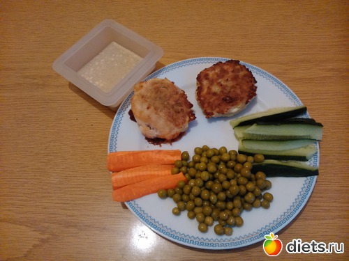 Ужин - 2 рыбные котлеты (морской окунь), морковь, огурец, зеленый горошек, к котлеткам сделала соус (творог, натуральный йогурт, соевый соус, приправы)...