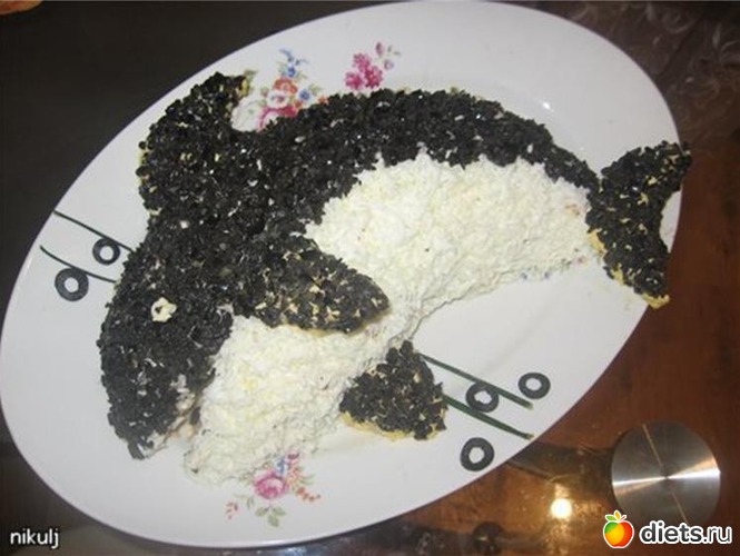 Слои можно выкладывать обыкновенно, по форме блюда или сделать вот такую касатку. Первым слоем выкладываются тертые плавленые сырки, затем пасированный лук, тунец, смесь мелко порезанного чернослива с молотыми орехами, огурцы и тертое яблоко. Можно промазывать каждый слой майонезом. Я не люблю когда его много, по этому не промазываю. Теперь очередь придать касатке узнаваемую окраску. Спинка выкладывается измельченными маслинами (не забудьте оставить немного на плавники и хвост). Живот выкладывается тертыми яичными белками. Из смеси желтков, чеснока и майонеза сформировать хвостик и плавники. Сверху покрыть их остатком маслинок. Глаз делается из майонеза и кусочка маслины. Перед подачей на стол охладить несколько часов в холодильнике.