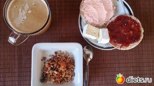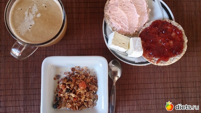 На завтрак был кофе с молоком, гранола собственного производства с орехами, сухофруктами и молоком, два хлебца, один с икрой мойвы, другой с вареньем- лайт, и кусочек сыра мягкого (на фото два, второй слопала доча)