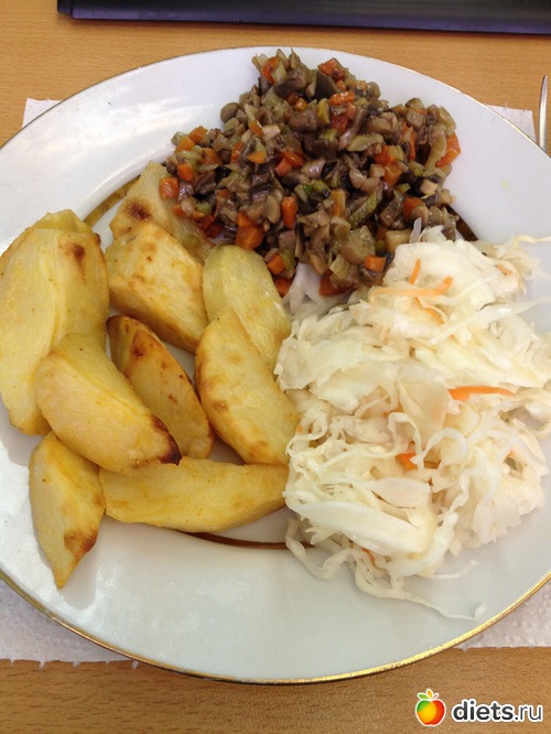 Обедала на работе, тем, что удалось купить в бижайшей кулинарии. Запеченый картофель, квашенная капуста и грибная икра! Вкусно было))).