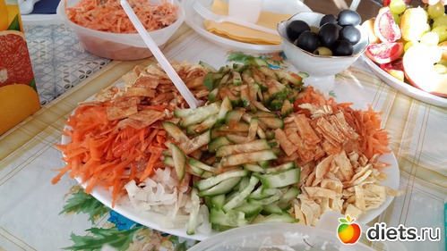 Это самый шикарный низкокалорийный салат,который на корпоративах все просят и едят с удовольствием.Если заинтересует,рецепт напишу завтра,у нас уже ночь,засыпаю,пишу одним глазом