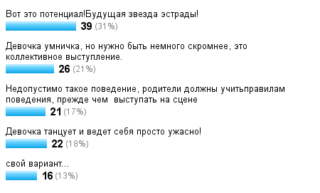 Была недавно на таком выступлении ! Внучка выступала! В группе дети разные и беленькие и темненькие, и возраст от 3 до 5! Ходят заниматься, чтоб просто заниматься, кто 2 года, кто 2 недели! Так вот- о выступлении: кто махал родным со сцены, кто кружился, почти никто не танцевал! Было мило и смешно! Смеяться было нельзя- обидятся ведь! Уверена кто нибудь снимал! Они же для нас самые лучшие! Ангелы ! Мне понравилось! А тут явный талант!