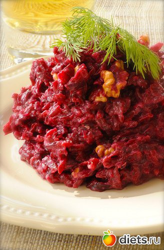 А на ужин я сделала себе салат:Свеклу отварить, натереть на мелкой терке, грецкий орех порубить, чеснок(по вкусу)выдавить, все перемешать добавить немножко майонеза. Получилось объедение