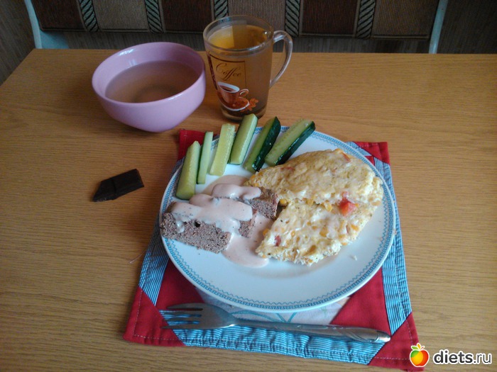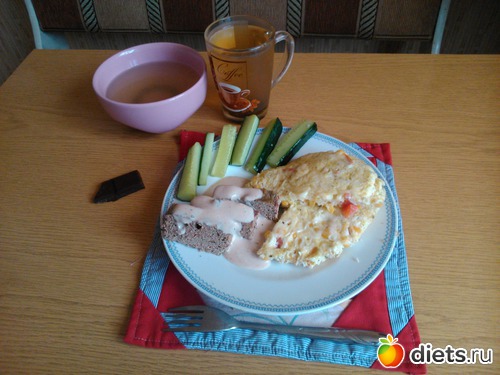 Обед - огурец, печеночное суфле, омлет (небольшой ломтик помидора, 3 ст. ложки кукурузы, 2 мелких яйца, совсем немного молока и специи - запекала в духовке), чай, ломтик темного шоколада.