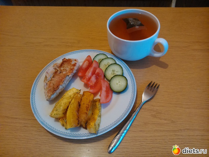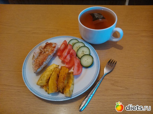 Ужин - пряная тыква и куриная грудка (в тарелочке смешала немного масла, чеснок и приправы, намазала тыквы и грудку, и запекла в духовке), огурчик, помидор, чай.