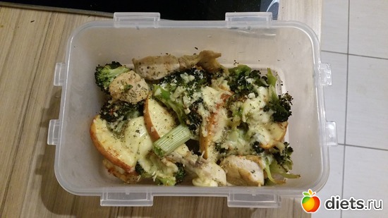 на обед будет запеканка из 120 г филе, броколли, 3 тёртых орешка. Специи и 30 г сыра.