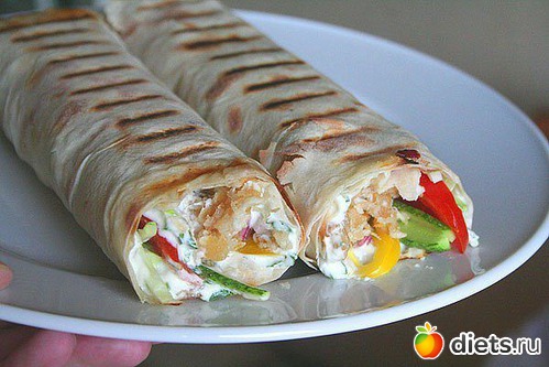 Для этого добавить в сметану порубленную петрушку, пропущенный через пресс чеснок, соль и перец, все хорошо перемешать. Затем замариновать в соли, сахаре и винном уксусе мелконарезанный красный салатный лук. Нарезать овощи. Нарезать нужной длины полоски лаваша и половину смазать соусом, сверху выложить овощную начинку. Мясной составляющей может быть отварная куриная грудка, сваренная заранее и нарезанная на мелкие кусочки. Грудку обжарить на раскаленном растительном масле, постоянно помешивая.