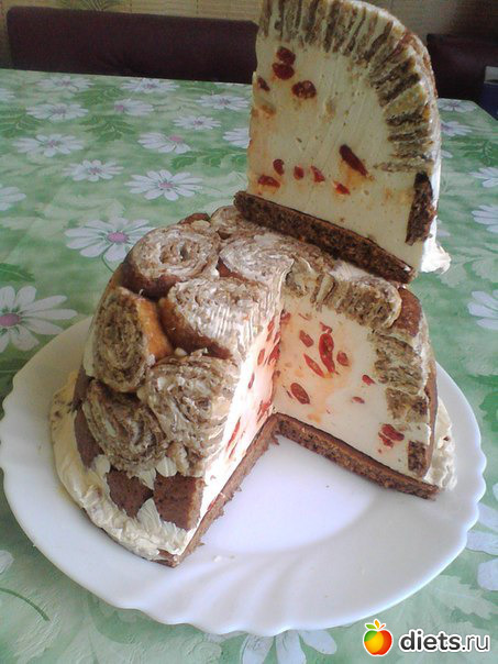 Сложенные блины в рулет. Также поступит с двумя другими блинами. Форму для торта (как говорила раньше, у меня круглая салатница) застелить пленкой. Блинные рулетики порезать кусочками в 1 см. Выложить дно салатницы и боковинки нарезанными блинными рулетиками. Т.к. рулетиков не хватает до края салатницы, то сверху рулетов по боку салатницы выложите кубики бисквита. В оставшийся творог добавьте оставшийся растворенный желатин и перемешайте. Смажьте тоненьким слоем творожной смеси бисквит. В творог добавить ягоды годжи, перемешайте и выложите в салатницу, она должна быть заполнена до краев. Сверху положите бисквит, намазанной стороной на творог, и прижмите. Сверху прикройте пленкой и уберите в холодильник для застывания. Снимите сверху пленку, положите на салатницу тарелку и переверните, снимите салатницу и пленку.
