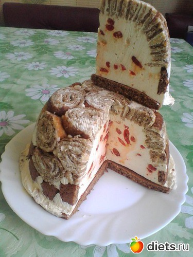Яйцо хорошо взбить (минуты 2-3), добавить творог, какао, крахмал, сахзам и перемешать миксе-ром, добавить разрыхлитель и отруби, перемешать. Противень застелить силиконовым ковриком, выложить тесто в виде круга на 1,5 см больше формы, в которой будете собирать торт (у меня круглая салатница в диаметре 14 см и 9 см в высоту). Выпекать при 180 градусах 10-15 минут. Вырезать круг по форме салатницы (для этого перевернутую салатницу прижать к бисквиту и по отпечатку ее внутренней стороны вырезать круг). Остатки бисквита порезать кубиками.