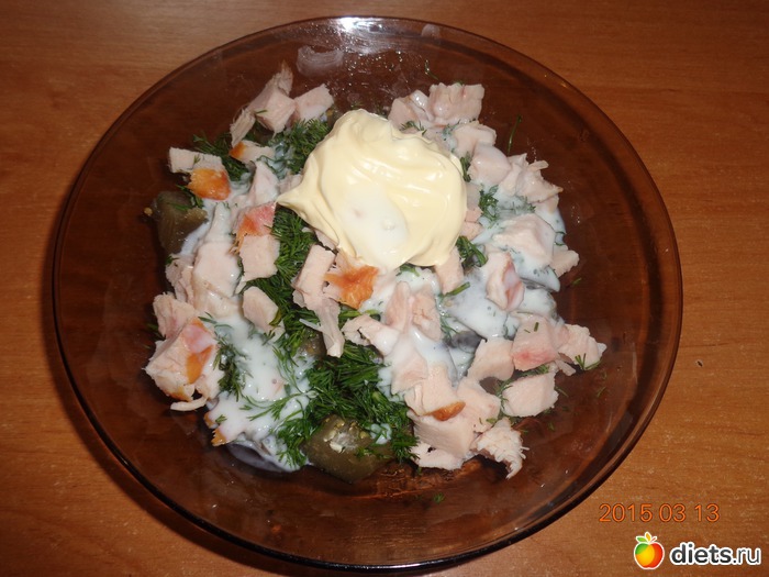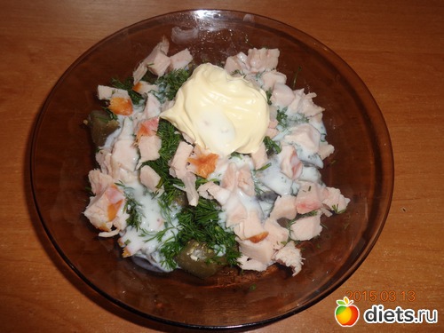 На обед мне захотелось салата. Поэтому было сооружено такое - маринованый баклажан, куриная грудка копченая, укроп и заправка с майонеза (знаю что кака и фу-фу-фу) и йогурта. Вышло очень вкусно.