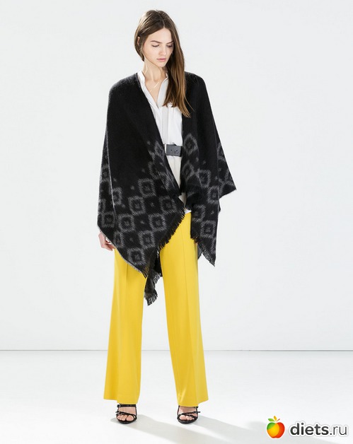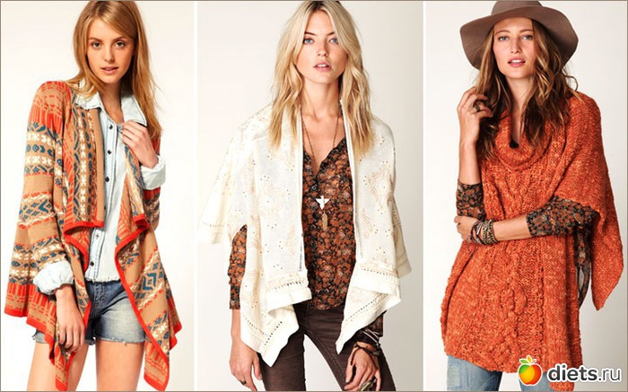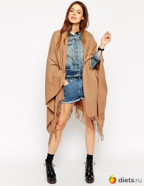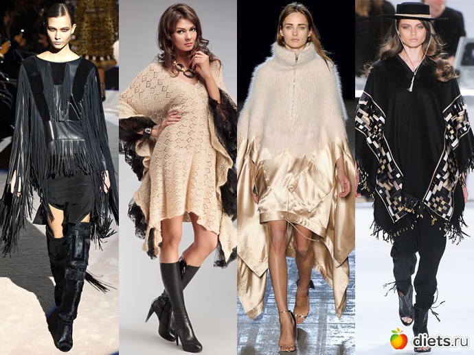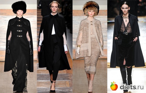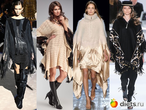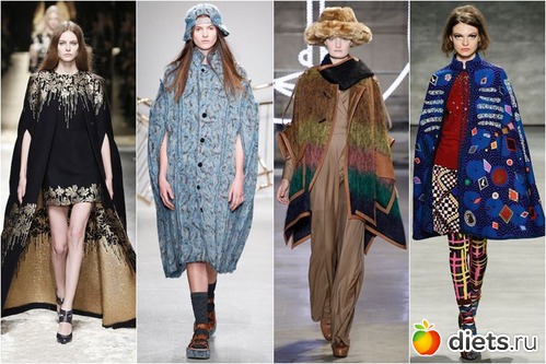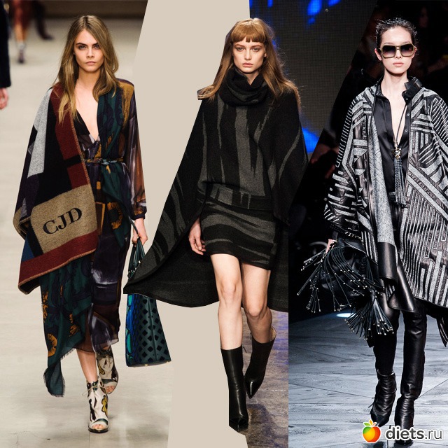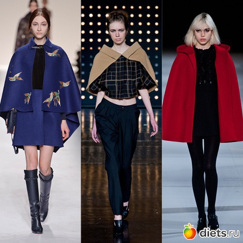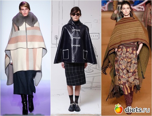 Ну и конечно такая деталь гардероба как накидка очень актуальна этим сезоном. В своих коллекциях дизайнеры решили продемонстрировать, что подобрать накидку можно практически под любой комплект одежды. Модная накидка не сковывает движений, согревает и скрадывает недостатки фигуры. В зависимости от длины и формы (прямоугольная или расклешенная, длинная или короткая) зависит её предназначение и то как она впишется в комплект одежды. В этом сезоне актуальны вязаные запахивающиеся модели, накиди-жакеты из костюмной ткани, трикотажные, которые носят к джемперу, меховые накидки из натурального меха.