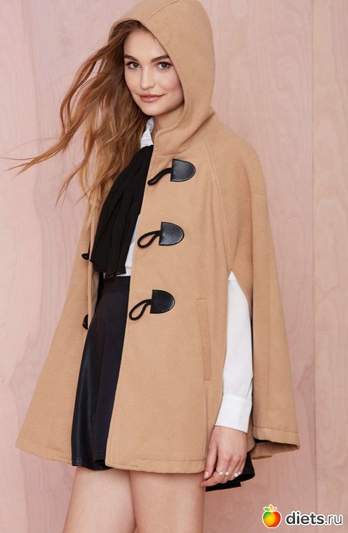 Модный кейп может быть наделён капюшоном, воротником большого или маленького размера, погонами, поясом, карманами и другими деталями.