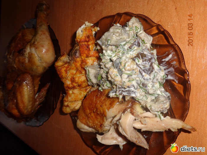 Пообедала курочкой с аэрогриля и салатом из маринованных баклажан. Мушшины мои тоже самое но еще с пюре картофельным.