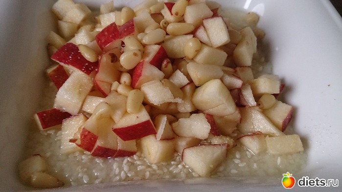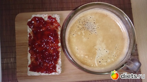 Завтрак: каша на воде с кускуса с яблоком, кедровыми орешками, кунжутом и сливочным маслом (3гр, чесслово), кофе с молоком и хлебец с вареньем легким