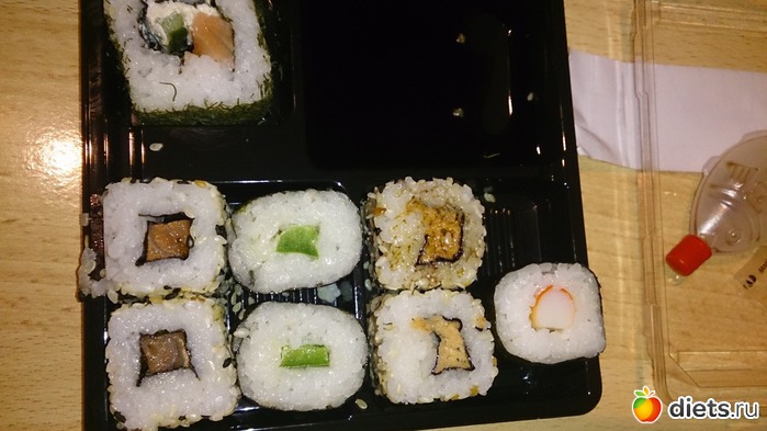 Ужин: по плану должен был быть омлет с творогом, но муж привез немного суши, я их обожаю и завтра видно соевый соус сделает свое черное дело, ну и ладно. Еще было 2 небольших кусочка пиццы с тунцом и еще пара печенек (понравились они мне).