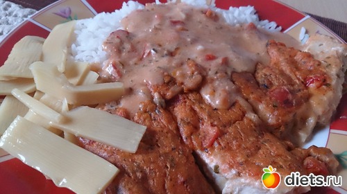 Обед: рис, рыба под соусом по-итальянски (полуфабрикат), побеги бамбука