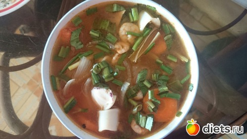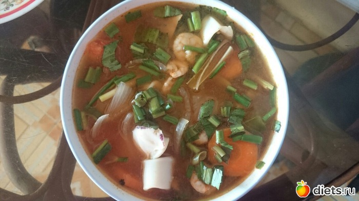 Сегодня рыбный день, но было лень готовить рыбу и я поехала с мужем в кафе и съела том ям с морепродуктами..