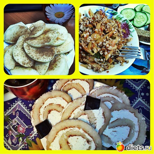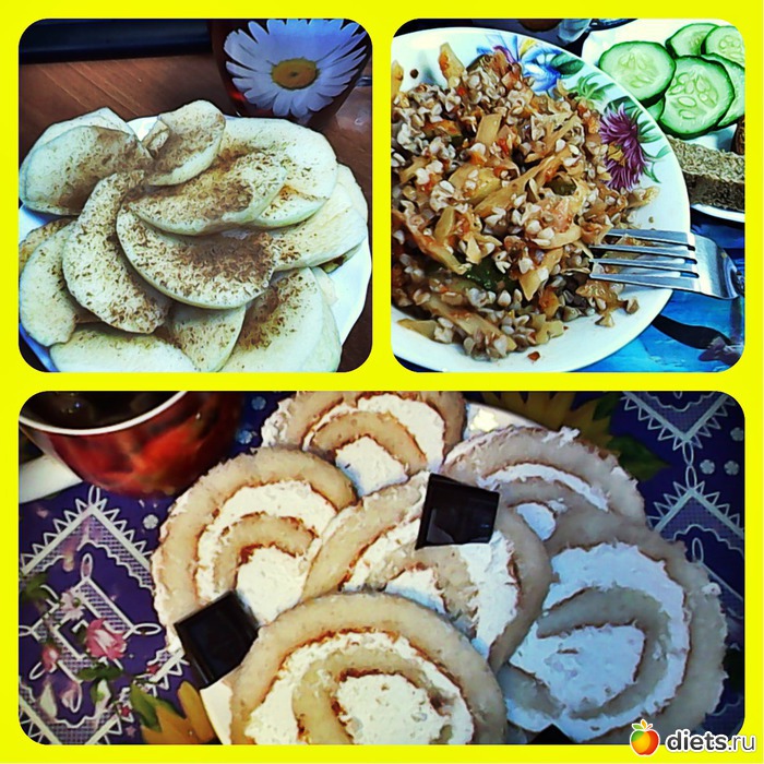 Завтрак: яблоки, Обед: Гречка с тушеной капустой, огурец и хлебушка Ужин: Рулет