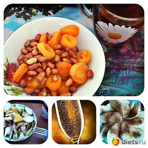 Завтрак; курага с арахисом Обед: Салат фруктовый и бокал шампанского Ужин яблоки
