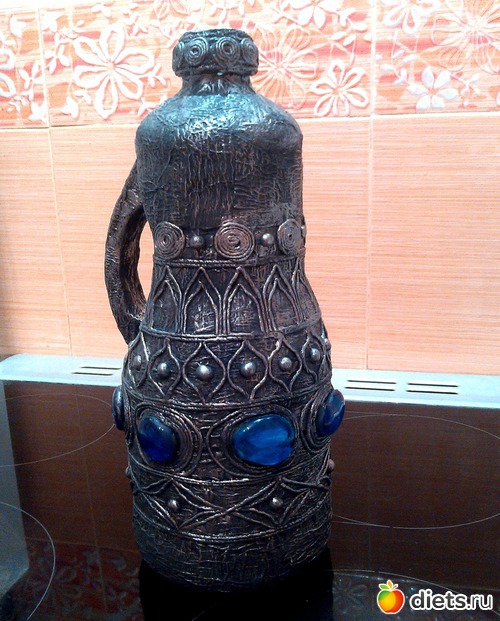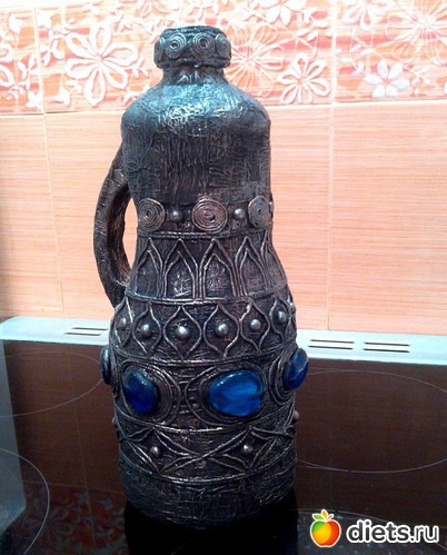 Этот кувшин сделала из пластиковой бутылки из-под подсолнечного масла, поливаю из него цветы.