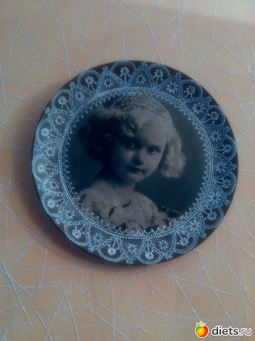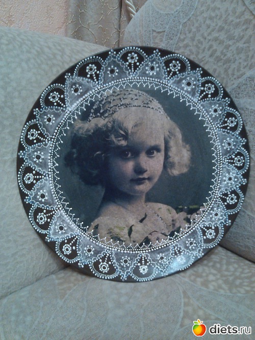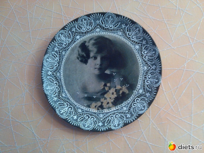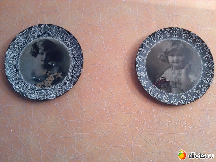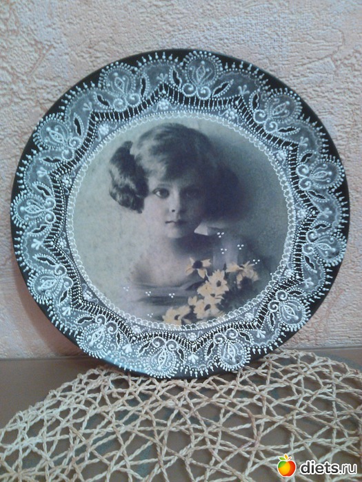 Тарелочки - декупаж распечаткой, кружево нарисовала акриловыми контурами и краской.