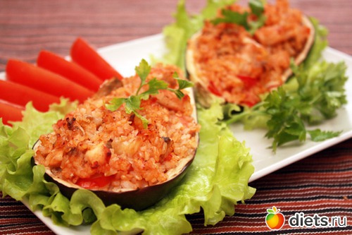 Полученной смесью наполняем наши баклажанные лодочки и сбрызгиваем их маслом. Накрываем фольгой и ставим в духовку на 30-40 минут. За 10 минут до окончания готовки фольгу лучше снять.