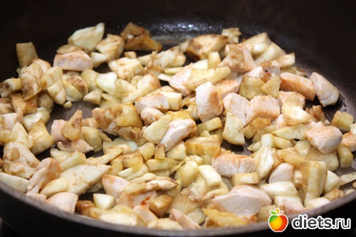 Куриную грудку нарезать кубиками и обжарить в небольшом количестве растительного масла.