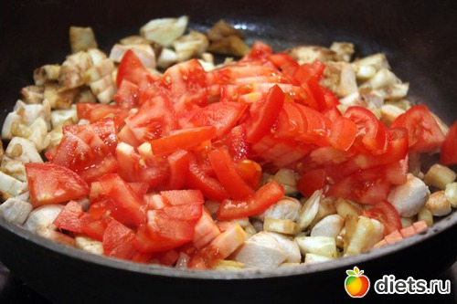 Помидоры нарезаем небольшими кусочками и отправляем в сковороду. Можно снять с них кожицу, но мне она не мешает, так что я ее оставила.