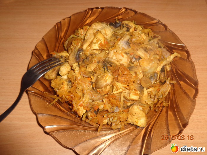 На обед потушила куриную грудку с капустой и грибами