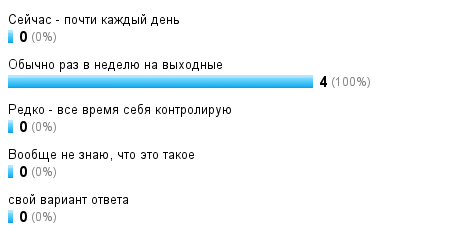 По-прежнему не ем десерты (ну это очень много калорий, неоправданно много - как половина моего дневного рациона), зато пью алкоголь - и винцо, и коньяк, и раз в пару недель пиво. Знаю, плохо. Более того, вижу по весу, что даже при малом количестве съеденного за день, не худеется совсем, если до этого чего-то выпивала. А вот делать ничего по этому поводу не буду