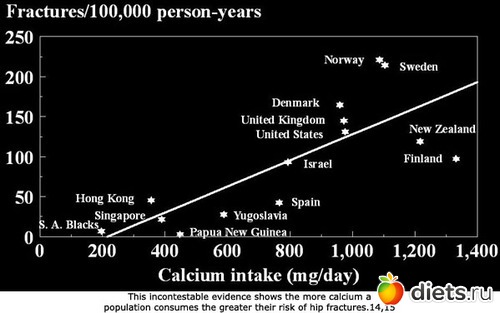 Из графика мы видим, что страны, которые потребляют больше всего молочных продуктов, имеют самую высокую статистику остеопороза и переломов (Норвегия, Швеция). И наоборот, самые крепкие кости и меньше всего остеопороза и переломов наблюдается в странах, которые практически не употребляют молочных продуктов (Сингапур и чернокожее население Южной Африки).