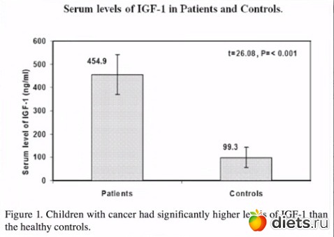 (На графике: Уровень ИГР-1 у больных раком и здоровых детей. Источник: Badr M, Hassan T, Tarhony SE, Metwally W. Insulin-like growth factor-1 and childhood cancer risk. Oncol Lett. 2010 Nov;1(6):1055-1059)